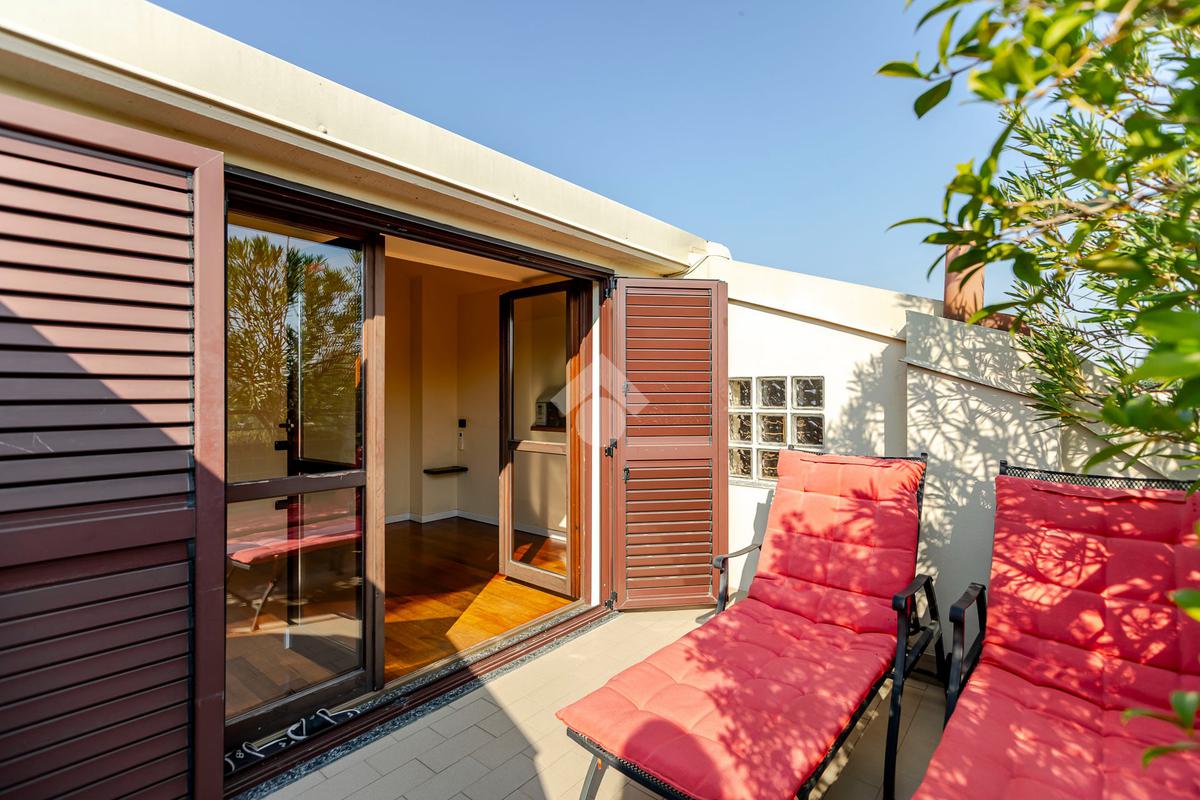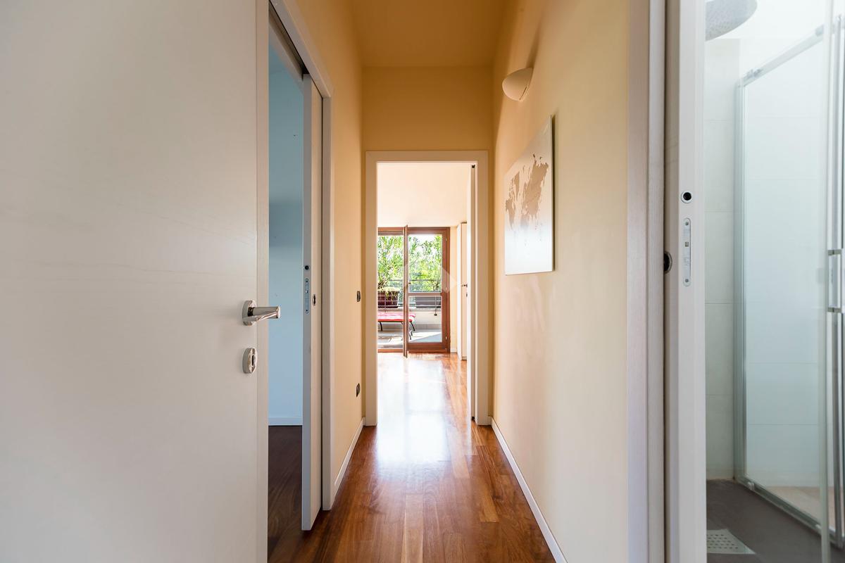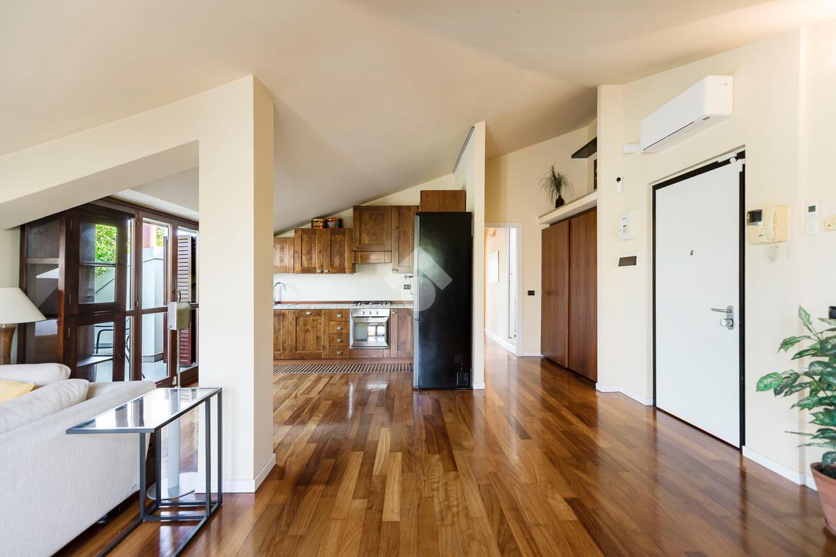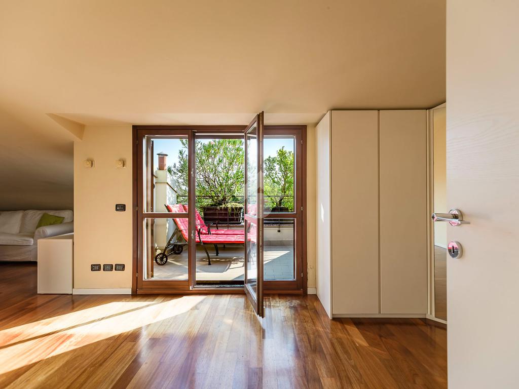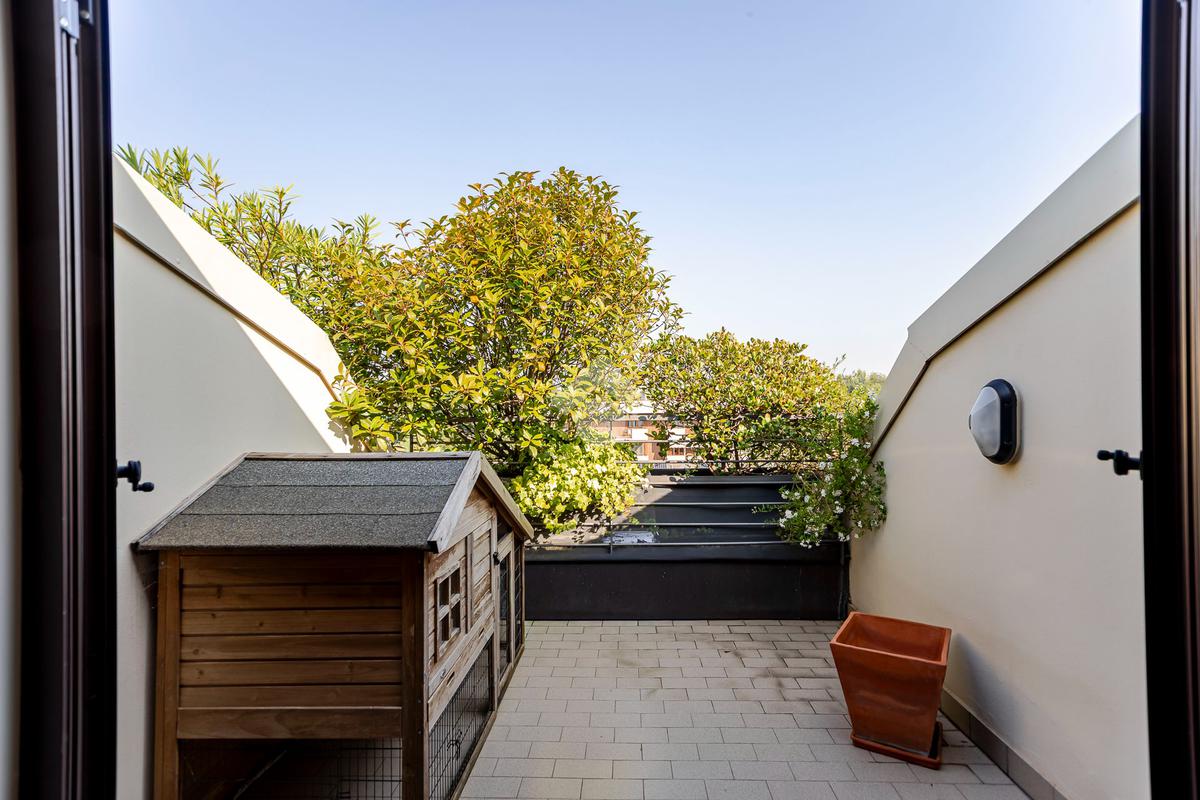 L'appartamento ha un ingresso su soggiorno con cucina a vista, disimpegno che separa la zona notte, dove troviamo un primo bagno di servizio finestrato. camera da letto matrimoniale con cabina armadio, una seconda camera da letto con un bagno privato ed un angolo studio. La soluzione ha quattro terrazzi e gode di una tripla esposizione.